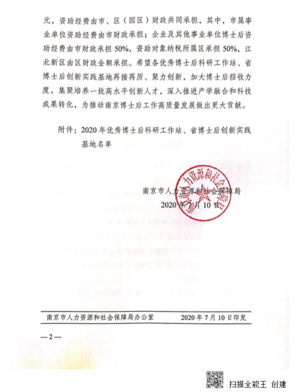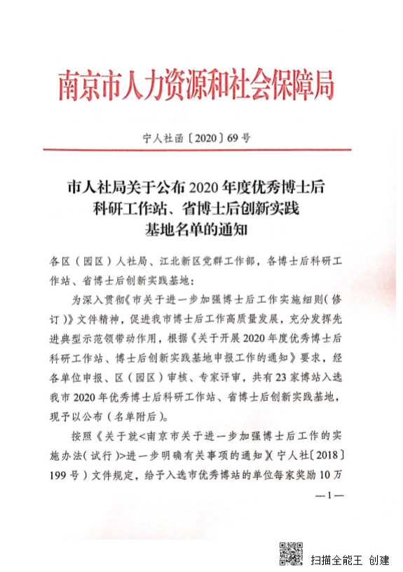 近日,南京市人社局公布了2020年優(yōu)秀博士后科研工作站、省博士后創(chuàng)新實(shí)踐基地名單,南大環(huán)保博士后科研工作站成功入選。